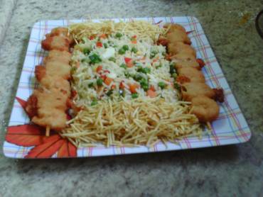 Refogue na manteiga a cenoura, os pimentões e a ervilha: acrescente o arroz e misture delicadamente, junto com os 2 ovos cozidos e picados e a salsinha